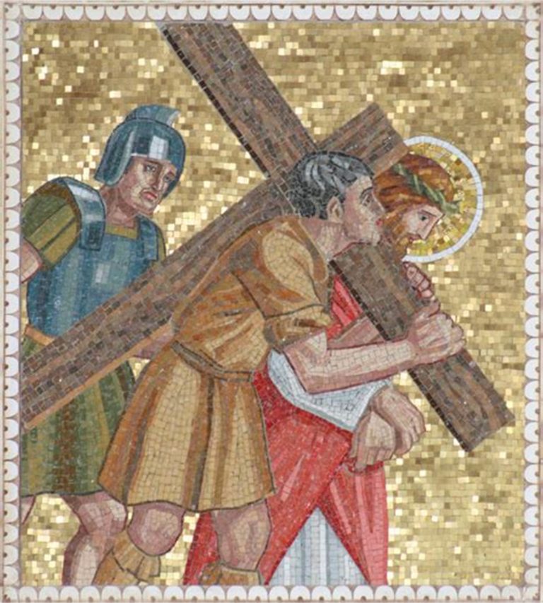 「無理やりに」ローマ兵から十字架を背負わせられ、イエズスの後ろを歩くことになったキレネ人のシモン。